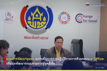 ในการประชุมครั้งนี้ ได้ดำเนินการกำหนดแนวทางการพัฒนาระบบสารบรรณอิเล็กทรอนิกส์ กรมการพัฒนาชุมชน โดยมีการนำระบบ e-Office มาใช้ในการปฏิบัติงาน ซึ่งเป็นการสนอง ตอบนโยบายรัฐบาลในการพัฒนาระบบราชการสู่ยุคดิจิทัล และสำนักงานไร้กระดาษ ซึ่งประกอบด้วย ระบบเอกสารดิจิทัล (ระบบสารบรรณ ระบบพิมพ์ร่างตรวจหนังสือ ระบบลงนามด้วยลายมือชื่ออิเล็กทรอนิกส์) ระบบบริหารการประชุม ระบบคลังจัดเก็บเอกสาร ระบบจองห้องประชุม และระบบจองรถยนต์ เป็นต้น โดยมุ่งหวังยกระดับกระบวนการทำงานให้มีความคล่องตัว ลดการใช้เอกสารกระดาษ และเพิ่มความโปร่งใสในการบริหารจัดการข้อมูล ทั้งยังช่วยให้การบริการประชาชนเป็นไปอย่างรวดเร็ว ทันสมัย และมีประสิทธิภาพมากยิ่งขึ้น